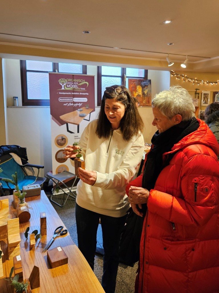 BU 3: Am Stand für organisch gestaltete Möbel auf dem Kulturmarkt bekam Oberbürgermeisterin Beate Kimmel handwerklich gestaltete Innendekoration präsentiert.